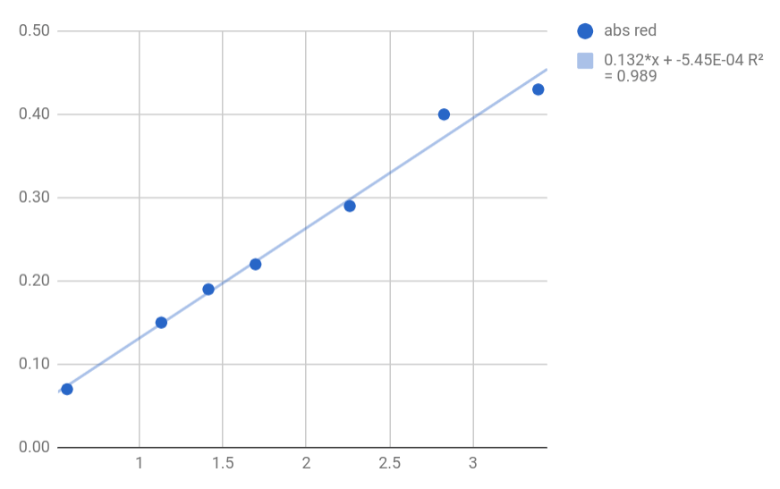 Based on a linear regression of our calibration curve we have determined that each candy contains 0.186 mg of blue patent V. This means that 5g of pigment is enough to pigment over 27 thousands of sharks.